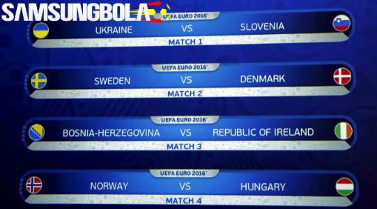 Dari hasil pengumuman yang berlangsung di markas UEFA, telah di tentukan Ukraina akan bertemu dengan Slovenia, Swedia akan bertemu dengan Denmark, Bosnia-Herzegovina akan berhadapan dengan Rep.Irandia dan Norwegia akan bertemu dengan Hungaria.