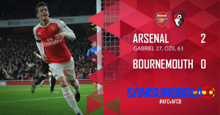 Arsenal mengalahkan AFC Bournemouth dengan skor 2-0 pada lanjutan Premier League di Stadion Emirates, Senin (28/12/2015). Mesut Oezil mencetak satu gol dan satu assist dalam pertandingan ini.