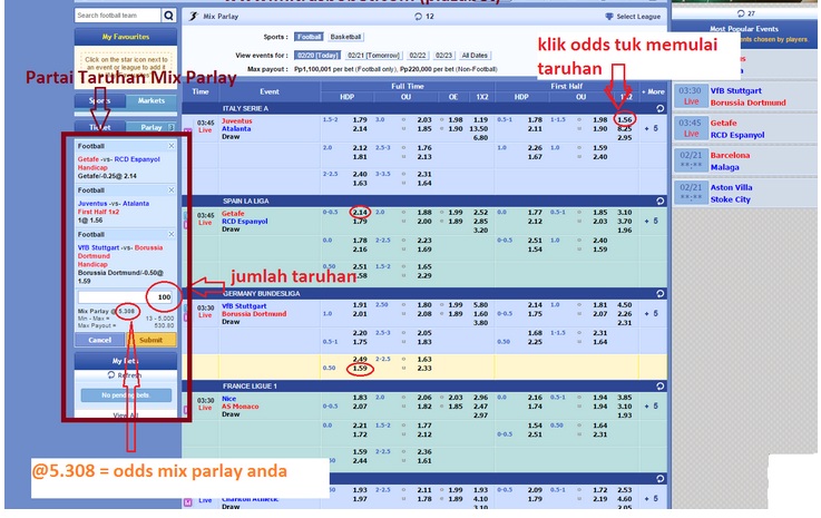 Hitung parlay : Kalikan saja nilai ketiga tim yang anda pilih a x b x c atau Nilai Odds yang sudah dihitung dikalikan saja dengan jumlah bet.