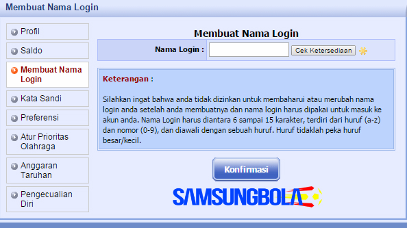 6.Nama Login Atau Login Name Harus Terdiri Dari Minimal 6 – 15 Karakter Kombinasi Huruf dan Angka Contohnya : samsungbola (11karakter)