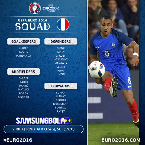 Inilah Skuat Resmi Prancis di ajang EURO 2016 yang aru saja mengumumkan 23 nama yang akan memperkuat Tim Ayam Jantan pada perhelatan Euro nanti.Pelatih Didier Deschamps tetap enggan untuk memasukkan para penyerang yang sedang tajam yaitu Karim Benzema, Kevin Gameiro dan Alexandre Lacazette.