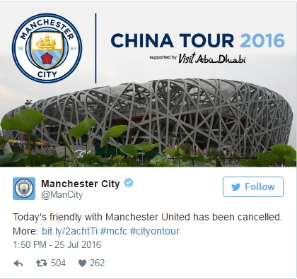 Derby Manchester di Tiongkok Resmi Dibatalkan - Sepertinya Keinginan para pecinta sepakbola harus bersedih untuk melihat Derby Manchester antara Manchester City vs Manchester United di Tiongkok, karena kedua klub dan penyelenggara ICC 2016 memutuskan untuk membatalkan pertandingan yang akan di gelar di beijing pada malam hari ini karena cuaca buruk yang tidak memunkingkan.