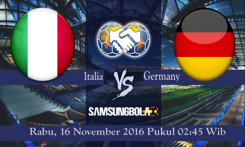 Italia akan menghadapi Jerman dalam pertemuan uji coba di stadium San Siro, Pada hari Rabu, Tanggal,16/11-2016 pukul 02:45 Waktu Indonesia Barat. Dalam pertemuan tersebut adalah pertandingan persahabatan.