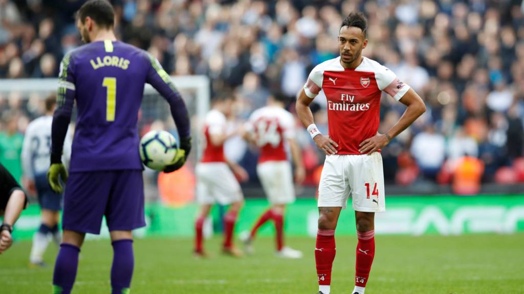 Tendangan Aubameyang diblokir kiper Spurs, Hugo Lloris. Alhasil, Arsenal harus menyudahi laga dengan kedudukan sama kuat 1-1.