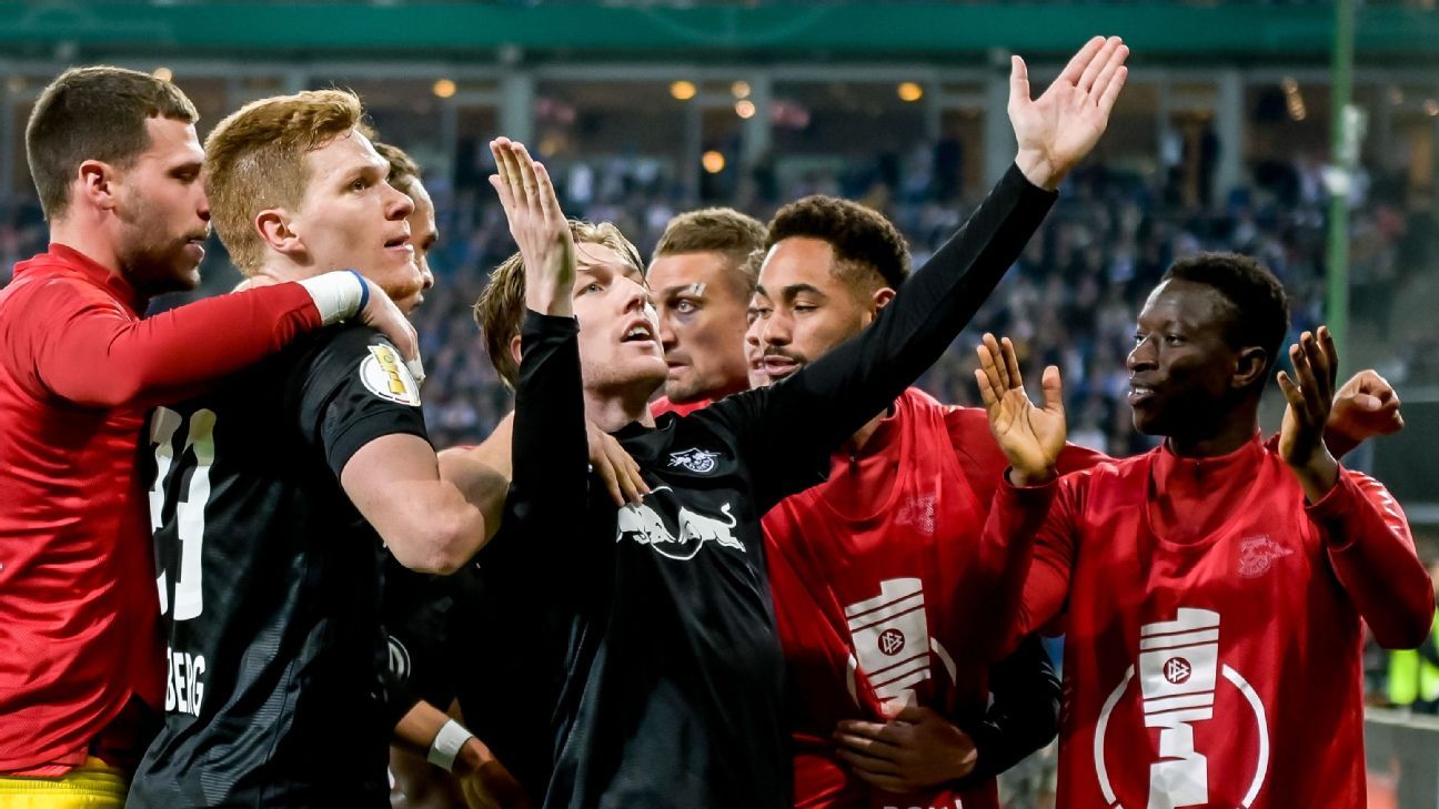 Leipzig memenangi partai semifinal di kandang Hamburg dengan skor 3-1, Rabu (24/4). Leipzig menang lewat gol-gol Yussuf Poulsen dan Emil Forsberg, serta satu own goal pemain Hamburg.