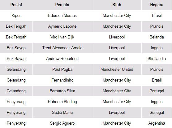The Citizens -julukan Manchester City- menyumbang enam pemain, yakni; Ederson Moraes (kiper), Aymeric Laporte (bek tengah), Fernandinho (gelandang), Bernardo Silva (gelandang), Raheem Sterling (penyerang) dan Sergio Aguero (penyerang). Selain dalam hal jumlah, dominasi City juga terasa merata karena menempati setiap lini.