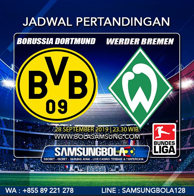 Samsungbola - Prediksi Borussia Dortmund Vs Werder Bremen 28 September 2019 Pada hari Sabtu, 28 September 2019 pukul 23:30 waktu indonesia barat akan di adakan laga pertandingan Liga Bundesliga antara Borussia Dortmund Vs Werder Bremen. Pertandingan ini nantinya akan di laksanakan di Stadion Westfalenstadion.