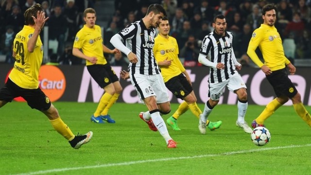 Striker yang diboyong dari Real Madrid, Alvaro Morata, sukses menjebol gawang Dortmund. Pemain internasional Spanyol ini memanfaatkan umpan Paul Pogba untuk mengoyak jala Dortmund, tim yang pernah mengalahkan Juventus 3-1 dalam final Liga Champions musim 1996-97 di Muenchen. Skor 2-1 bertahan hingga jeda.