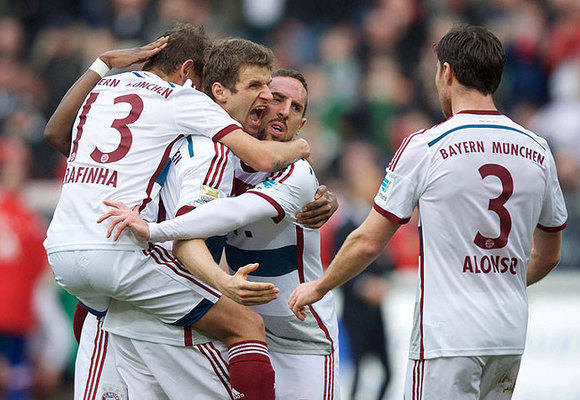 Bayern Muenchen menang 3-1 atas Hannover 96 pada pertandingan lanjutan Bundesliga di AWD-Arena, Hannover, Sabtu (7/3/2015). Hasil ini membuat Bayern kian kokoh di puncak klasemen sementara Bundesliga dengan mengumpulkan 61 poin, unggul 11 poin dari pesaing terdekatnya, Wolfsburg.