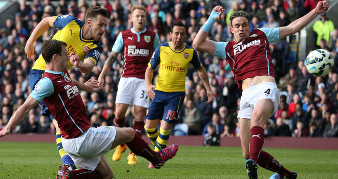 Arsenal meraih kemenangan 1-0 atas Burnley dalam laga lanjutan Premier League yang berlangsung di Stadion Turf Moor, Burnley, Sabtu (11/4/2015). Gol semata wayang Arsenal dicetak oleh Aaron Ramsey.
